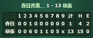 | 2587 幕張 | ● | 13 - 1 | ● | 春日井東 2150 | ||||||||