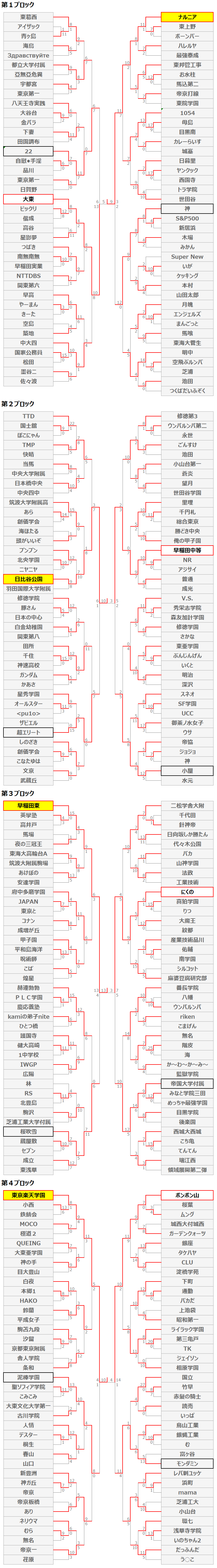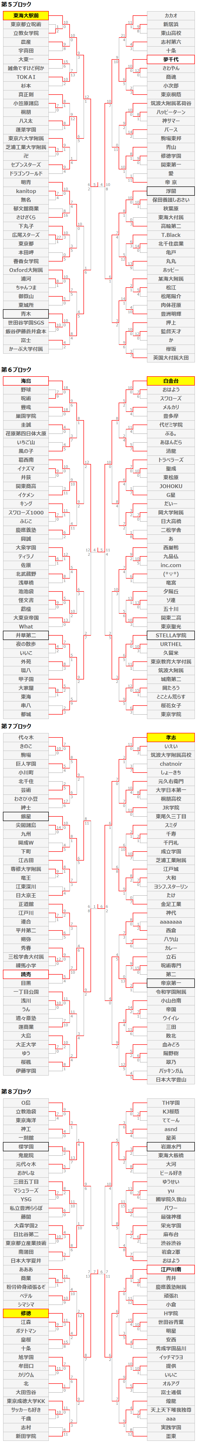 | 7 | 雑魚ですけど何か | さわやん | 荏原第四日体大原 | ぶる。 | 芸術 | 大学日本第一 | 鬼龍院 | 東海大板橋 |